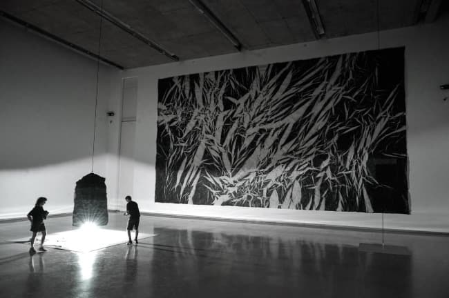 La exposición invita al visitante a situarse en una enorme sala que es iluminada por una única fuente de luz ubicada en el suelo, cerca del centro. Su resplandor alcanza cada rincón. Una campana negra de metal, accionada por un motor, una hélice y un sistema de poleas, se eleva y desciende rítmicamente sobre ella. Al cubrir la luz, sumerge la sala en una oscuridad total; al descubrirla, restituye la visibilidad de inmediato. Así, la mirada de los visitantes se interrumpe una y otra vez, y la percepción del entorno se modifica con cada ciclo. En una de las paredes laterales, un dibujo de dimensiones monumentales ocupa casi toda la superficie. La imagen abstracta, en blanco y negro, revela en sus pliegues el proceso que le dio origen. El papel fue replegado repetidas veces sobre sí mismo, aplanado y pintado de negro en toda la superficie. Luego se volvió a desplegar hasta recuperar su tamaño original, exhibiendo al mismo tiempo los planos negros pintados anteriormente y las áreas sin cubrir que permanecieron ocultas entre los pliegues. Si en proyectos anteriores la obra de Basualdo proponía una mirada introspectiva hacia el interior del cuerpo, en esta exposición la atención vuelve a dirigirse hacia afuera, al entorno en el que se mueven los cuerpos. Sin embargo, esa mirada aparece ahora accidentada: se interrumpe en su continuidad como si el espacio se plegara y desplegara entre luces y sombras.