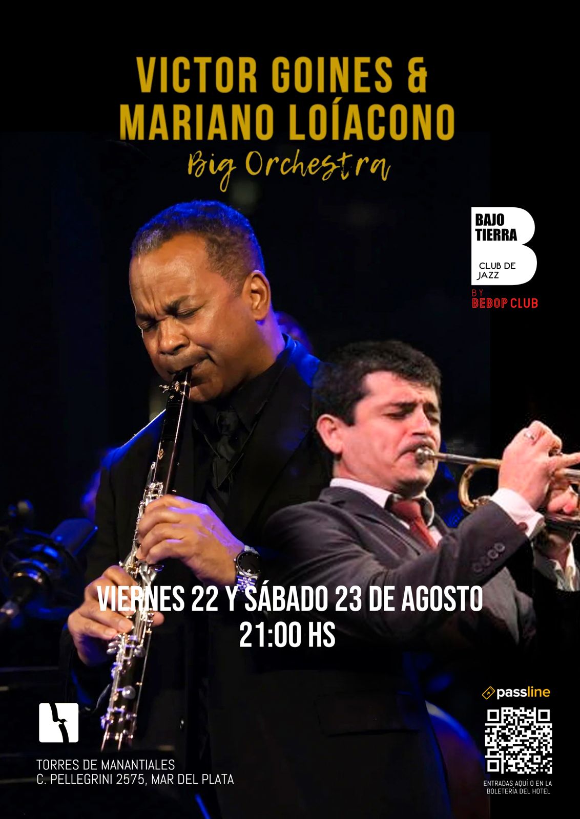BajoTierra by Bebop Club presenta dos noches monumentales de jazz en Mar del Plata con la participación estelar del saxofonista y clarinetista estadounidense Victor Goines, acompañado por la imponente Mariano Loiácono Big Orchestra. La cita será una oportunidad única para disfrutar del swing arrollador y la sofisticación orquestal de una big band en pleno, interpretando un repertorio explosivo especialmente arreglado para esta colaboración. Un encuentro entre Nueva Orleans y Buenos Aires que promete sacudir el escenario con fuerza y elegancia.