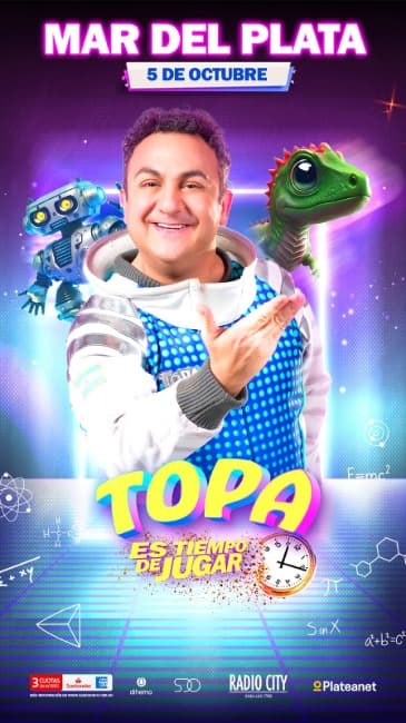 “Topa, es tiempo de jugar” fue una experiencia teatral y un viaje en el tiempo que hizo vibrar a todas las familias desde el 2023. Acompañado por dinosaurios, robots, el glamour de los años ‘70 y un gran elenco de actores y bailarines, vivió increíbles aventuras junto a su público amado. Con gran impacto visual y un equipo creativo de lujo, esta propuesta llega a todo el país para seguir sorprendiendo y animando a chicos y grandes. Para cantar, bailar, reír y soñar en familia.